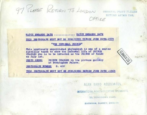 Prince Charles Buckingham Palace 1969 Original Stamped 8x10 Photo Royal Family VG/Near Mint This item is an ORIGINAL 8x10 photo from the historic archives of Silver Screen Mementos. This original photograph was made in the actual year the film, television show or event was produced. The movie studios produced publicity photographs for distribution to the press, photo agencies and publicity departments to advertise the film/tv show or event. Very often original photos have press release information on the reverse of the photo - movie credits, description of the scene, event and people involved. This is a historic piece of cinema art and is being offered from one collector to another, no rights given or implied. Silver Screen are gradually releasing thousands of Original Photographs, Transparencies, Negatives, Lobby Cards, Posters, Magazines and other memorabilia from our historic archive. Powered by SixBit's eCommerce Solution Listing and template services provided by inkFrog