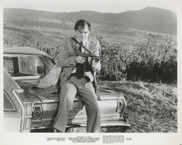 Bring Me the Head of Alfredo Garcia Gig Young with machine gun Sam Peckinpah Classic Original 8x10 Photo 1974 Near Mint Condition This item is an ORIGINAL 8x10 photo from the historic archives of Silver Screen Mementos. This original photograph was made in the actual year the film, television show or event was produced. The movie studios produced publicity photographs for distribution to the press, photo agencies and publicity departments to advertise the film/tv show or event. Very often original photos have press release information on the reverse of the photo - movie credits, description of the scene, event and people involved. This is a historic piece of cinema art and is being offered from one collector to another, no rights given or implied. Silver Screen are gradually releasing thousands of Original Photographs, Transparencies, Negatives, Lobby Cards, Posters, Magazines and other memorabilia from our historic archive. Powered by SixBit's eCommerce Solution Listing and template services provided by inkFrog