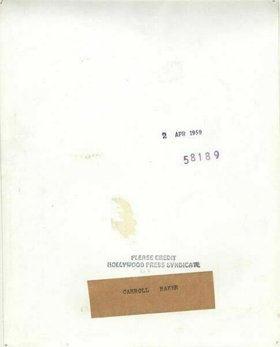 Carroll Baker Vintage 1959 Young Glamour Portrait Stamped Original Photograph VG/Near Mint This item is an ORIGINAL 8x10 photo from the historic archives of Silver Screen Mementos. This original photograph was made in the actual year the film, television show or event was produced. The movie studios produced publicity photographs for distribution to the press, photo agencies and publicity departments to advertise the film/tv show or event. Very often original photos have press release information on the reverse of the photo - movie credits, description of the scene, event and people involved. This is a historic piece of cinema art and is being offered from one collector to another, no rights given or implied. Silver Screen are gradually releasing thousands of Original Photographs, Transparencies, Negatives, Lobby Cards, Posters, Magazines and other memorabilia from our historic archive. Powered by SixBit's eCommerce Solution Listing and template services provided by inkFrog