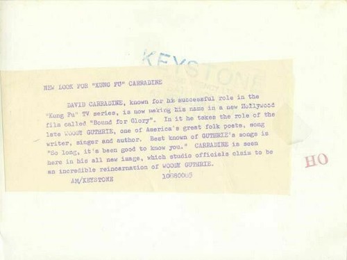 David Carradine plays guitar Vintage freight train Bound for Glory Original Photo with paper caption snipe on back in VG/Near Mint Condition This item is an ORIGINAL 8x10 photo from the historic archives of Silver Screen Mementos. This original photograph was made in the actual year the film, television show or event was produced. The movie studios produced publicity photographs for distribution to the press, photo agencies and publicity departments to advertise the film/tv show or event. Very often original photos have press release information on the reverse of the photo - movie credits, description of the scene, event and people involved. This is a historic piece of cinema art and is being offered from one collector to another, no rights given or implied. Silver Screen are gradually releasing thousands of Original Photographs, Transparencies, Negatives, Lobby Cards, Posters, Magazines and other memorabilia from our historic archive. Powered by SixBit's eCommerce Solution Listing and template services provided by inkFrog