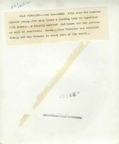 Joan Fontaine Vintage Studio Glamour Portrait Stamped Original Photograph with paper caption snipe on back in VG/Near Mint Condition This item is an ORIGINAL 8x10 photo from the historic archives of Silver Screen Mementos. This original photograph was made in the actual year the film, television show or event was produced. The movie studios produced publicity photographs for distribution to the press, photo agencies and publicity departments to advertise the film/tv show or event. Very often original photos have press release information on the reverse of the photo - movie credits, description of the scene, event and people involved. This is a historic piece of cinema art and is being offered from one collector to another, no rights given or implied. Silver Screen are gradually releasing thousands of Original Photographs, Transparencies, Negatives, Lobby Cards, Posters, Magazines and other memorabilia from our historic archive. Powered by SixBit's eCommerce Solution Listing and template services provided by inkFrog