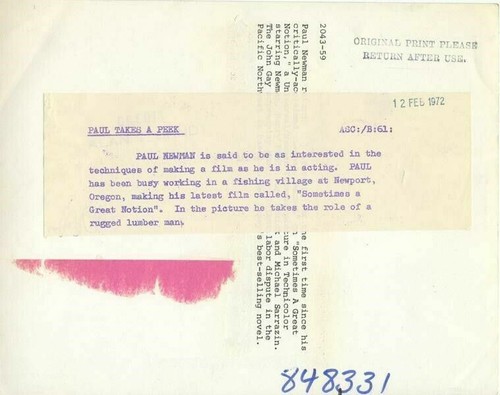 Paul Newman Directing by movie camera Sometimes A Great Notion Original Photo 1972 with paper caption snipe on verson in VG/Nera Mint Condition This item is an ORIGINAL 8x10 photo from the historic archives of Silver Screen Mementos. This original photograph was made in the actual year the film, television show or event was produced. The movie studios produced publicity photographs for distribution to the press, photo agencies and publicity departments to advertise the film/tv show or event. Very often original photos have press release information on the reverse of the photo - movie credits, description of the scene, event and people involved. This is a historic piece of cinema art and is being offered from one collector to another, no rights given or implied. Silver Screen are gradually releasing thousands of Original Photographs, Transparencies, Negatives, Lobby Cards, Posters, Magazines and other memorabilia from our historic archive. Powered by SixBit's eCommerce Solution Listing and template services provided by inkFrog
