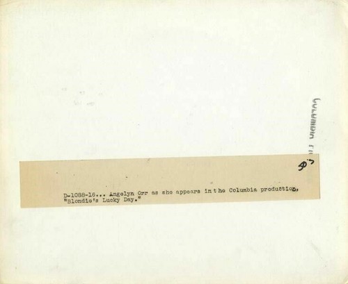 Angelyn Orr Blondie's Lucky Day 1946 Portrait Stamped Original 8x10 Photo Near Mint Condition This item is an ORIGINAL 8x10 photo from the historic archives of Silver Screen Mementos. This original photograph was made in the actual year the film, television show or event was produced. The movie studios produced publicity photographs for distribution to the press, photo agencies and publicity departments to advertise the film/tv show or event. Very often original photos have press release information on the reverse of the photo - movie credits, description of the scene, event and people involved. This is a historic piece of cinema art and is being offered from one collector to another, no rights given or implied. Silver Screen are gradually releasing thousands of Original Photographs, Transparencies, Negatives, Lobby Cards, Posters, Magazines and other memorabilia from our historic archive. Powered by SixBit's eCommerce Solution Listing and template services provided by inkFrog