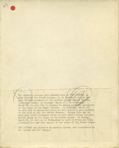 Yul Brynner smoking cigarette THE JOURNEY Studio Portrait Original 8x10 Photo with paper caption snipe in VG/Near Mint Condition This item is an ORIGINAL 8x10 photo from the historic archives of Silver Screen Mementos. This original photograph was made in the actual year the film, television show or event was produced. The movie studios produced publicity photographs for distribution to the press, photo agencies and publicity departments to advertise the film/tv show or event. Very often original photos have press release information on the reverse of the photo - movie credits, description of the scene, event and people involved. This is a historic piece of cinema art and is being offered from one collector to another, no rights given or implied. Silver Screen are gradually releasing thousands of Original Photographs, Transparencies, Negatives, Lobby Cards, Posters, Magazines and other memorabilia from our historic archive. Powered by SixBit's eCommerce Solution Listing and template services provided by inkFrog