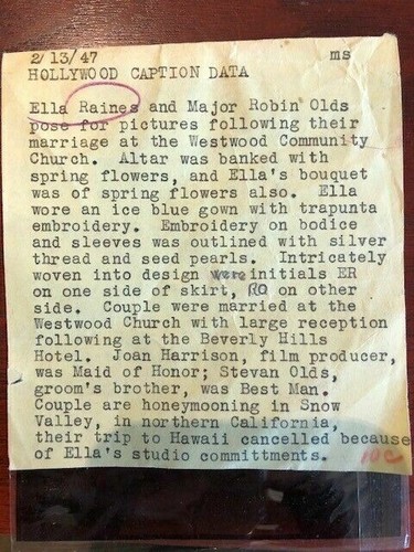 Ella Raines 1947 Wedding photo Original 5x4 Transparency & paper caption snipe This is an Original studio or photographer's 4x5 inches color slide transparency from our historic archive. This is a real collector's item and would make superb quality photographs or prints. This would also be a great addition to any collection or image archive. This original negative color slide transparency is in Excellent condition. This collector's item is being sold from one collector to another, no rights are given or implied. Silver Screen Mementos are gradually releasing from their vast archives thousands of original photographs, transparencies, negatives, slides, lobby cards and other movie or television memorabilia. Powered by SixBit's eCommerce Solution Listing and template services provided by inkFrog