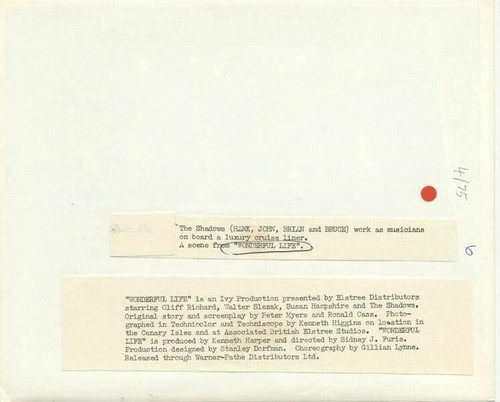 THE SHADOWS British Pop Group Original 1964 Wonderful Life Photo Hank Marvin, John Rostill, Bruce Welch, Brian Bennett 8x10 stamped with paper caption snipe on verso in VG/Near Mint Condition This item is an ORIGINAL 8x10 photo from the historic archives of Silver Screen Mementos. This original photograph was made in the actual year the film, television show or event was produced. The movie studios produced publicity photographs for distribution to the press, photo agencies and publicity departments to advertise the film/tv show or event. Very often original photos have press release information on the reverse of the photo - movie credits, description of the scene, event and people involved. This is a historic piece of cinema art and is being offered from one collector to another, no rights given or implied. Silver Screen are gradually releasing thousands of Original Photographs, Transparencies, Negatives, Lobby Cards, Posters, Magazines and other memorabilia from our historic archive. Powered by SixBit's eCommerce Solution Listing and template services provided by inkFrog