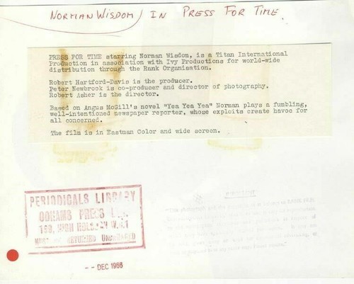 Norman Wisdom 1966 Press For Time portrait Original Photo with paper snipe VG/Near Mint This item is an ORIGINAL 8x10 photo from the historic archives of Silver Screen Mementos. This original photograph was made in the actual year the film, television show or event was produced. The movie studios produced publicity photographs for distribution to the press, photo agencies and publicity departments to advertise the film/tv show or event. Very often original photos have press release information on the reverse of the photo - movie credits, description of the scene, event and people involved. This is a historic piece of cinema art and is being offered from one collector to another, no rights given or implied. Silver Screen are gradually releasing thousands of Original Photographs, Transparencies, Negatives, Lobby Cards, Posters, Magazines and other memorabilia from our historic archive. Powered by SixBit's eCommerce Solution Listing and template services provided by inkFrog