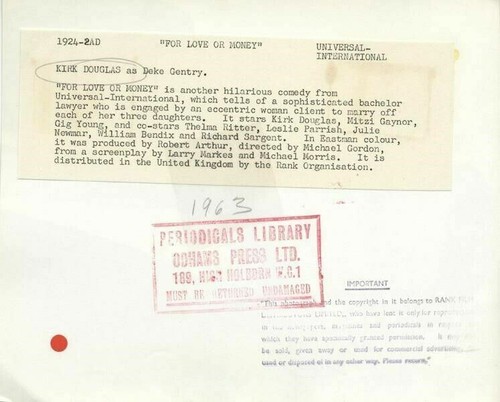Kirk Douglas Vintage portrait FOR LOVE OR MONEY Original 8x10 Stamped Photo VG/Near Mint This item is an ORIGINAL 8x10 photo from the historic archives of Silver Screen Mementos. This original photograph was made in the actual year the film, television show or event was produced. The movie studios produced publicity photographs for distribution to the press, photo agencies and publicity departments to advertise the film/tv show or event. Very often original photos have press release information on the reverse of the photo - movie credits, description of the scene, event and people involved. This is a historic piece of cinema art and is being offered from one collector to another, no rights given or implied. Silver Screen are gradually releasing thousands of Original Photographs, Transparencies, Negatives, Lobby Cards, Posters, Magazines and other memorabilia from our historic archive. Powered by SixBit's eCommerce Solution Listing and template services provided by inkFrog