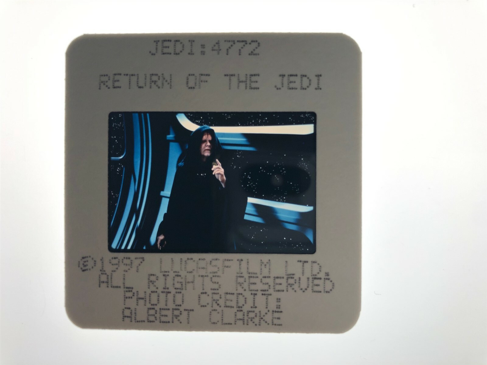 Star Wars Return of the Jedi Ian McDiarmid Emperor Original 35mm Transparency Stamped Mount 1997This is an Original studio or photographer's 35 mm color slide transparency from our historic archive. This is a real collector's item and would make superb quality photographs or prints. This would also be a great addition to any collection or image archive. This original negative color slide transparency is in Excellent condition. This collector's item is being sold from one collector to another, no rights are given or implied. Silver Screen Mementos are gradually releasing from their vast archives thousands of original photographs, transparencies, negatives, slides, lobby cards and other movie or television memorabilia.