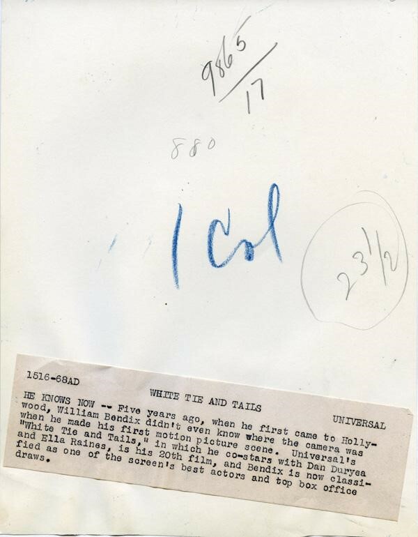 William Bendix Universal Studio Portrait White Tie and Tails Original Photo with snipe in VG Condition This item is an ORIGINAL 8x10 photo from the historic archives of Silver Screen Mementos. This original photograph was made in the actual year the film, television show or event was produced. The movie studios produced publicity photographs for distribution to the press, photo agencies and publicity departments to advertise the film/tv show or event. Very often original photos have press release information on the reverse of the photo - movie credits, description of the scene, event and people involved. This is a historic piece of cinema art and is being offered from one collector to another, no rights given or implied. Silver Screen are gradually releasing thousands of Original Photographs, Transparencies, Negatives, Lobby Cards, Posters, Magazines and other memorabilia from our historic archive.
