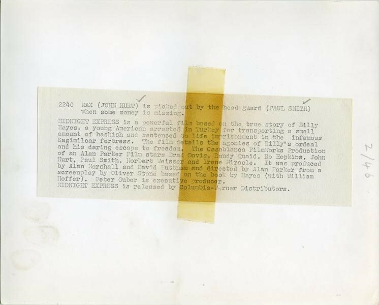 Midnight Express Paul Smith beating John Hurt Original 8x10 Photo with snipe in Near Mint Condition This item is an ORIGINAL 8x10 photo from the historic archives of Silver Screen Mementos. This original photograph was made in the actual year the film, television show or event was produced. The movie studios produced publicity photographs for distribution to the press, photo agencies and publicity departments to advertise the film/tv show or event. Very often original photos have press release information on the reverse of the photo - movie credits, description of the scene, event and people involved. This is a historic piece of cinema art and is being offered from one collector to another, no rights given or implied. Silver Screen are gradually releasing thousands of Original Photographs, Transparencies, Negatives, Lobby Cards, Posters, Magazines and other memorabilia from our historic archive.