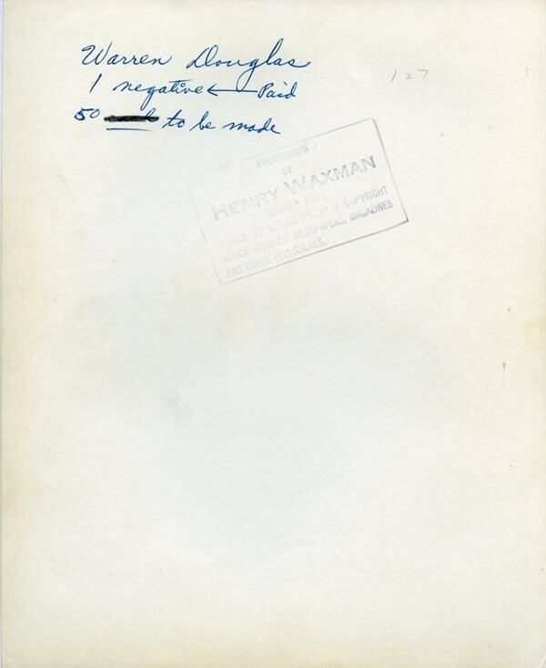 Warren Douglas portrait Stamped by photographer Henry Waxman Original 8x10 Photo VG/Near Mint Condition This item is an ORIGINAL 8x10 photo from the historic archives of Silver Screen Mementos. This original photograph was made in the actual year the film, television show or event was produced. The movie studios produced publicity photographs for distribution to the press, photo agencies and publicity departments to advertise the film/tv show or event. Very often original photos have press release information on the reverse of the photo - movie credits, description of the scene, event and people involved. This is a historic piece of cinema art and is being offered from one collector to another, no rights given or implied. Silver Screen are gradually releasing thousands of Original Photographs, Transparencies, Negatives, Lobby Cards, Posters, Magazines and other memorabilia from our historic archive.