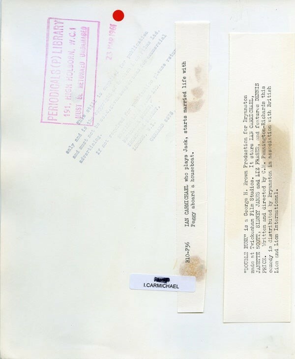 Ian Carmichael Vintage Stamped Studio Portrait Double Bunk Original 8x10 Photo VG/Near Mint This item is an ORIGINAL 8x10 photo from the historic archives of Silver Screen Mementos. This original photograph was made in the actual year the film, television show or event was produced. The movie studios produced publicity photographs for distribution to the press, photo agencies and publicity departments to advertise the film/tv show or event. Very often original photos have press release information on the reverse of the photo - movie credits, description of the scene, event and people involved. This is a historic piece of cinema art and is being offered from one collector to another, no rights given or implied. Silver Screen are gradually releasing thousands of Original Photographs, Transparencies, Negatives, Lobby Cards, Posters, Magazines and other memorabilia from our historic archive.