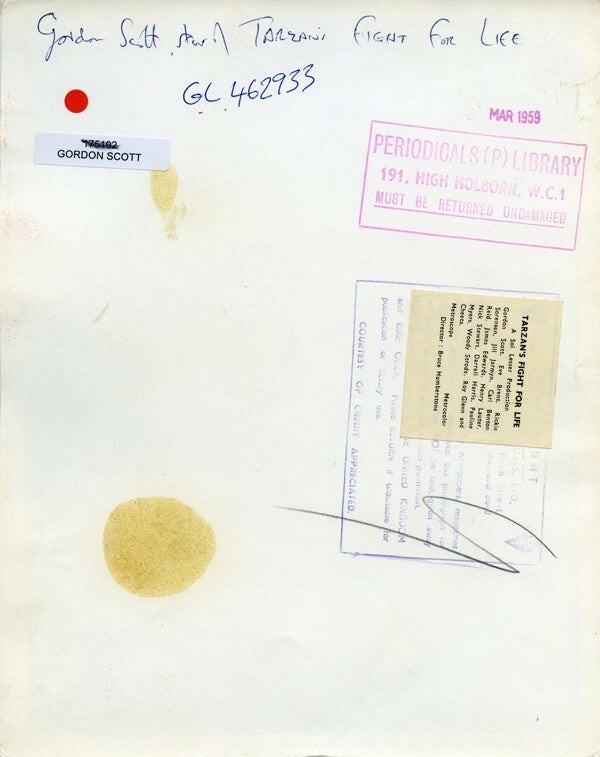 Gordon Scott Tarzan's Fight For Life barechested classic Original Stamped Photo VG/Near Mint This item is an ORIGINAL 8x10 photo from the historic archives of Silver Screen Mementos. This original photograph was made in the actual year the film, television show or event was produced. The movie studios produced publicity photographs for distribution to the press, photo agencies and publicity departments to advertise the film/tv show or event. Very often original photos have press release information on the reverse of the photo - movie credits, description of the scene, event and people involved. This is a historic piece of cinema art and is being offered from one collector to another, no rights given or implied. Silver Screen are gradually releasing thousands of Original Photographs, Transparencies, Negatives, Lobby Cards, Posters, Magazines and other memorabilia from our historic archive.