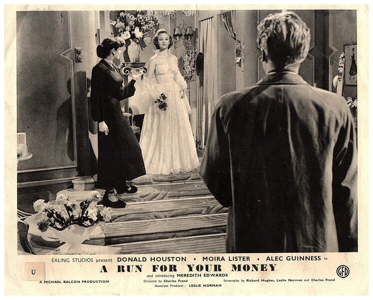 A Run for Your Money Original Lobby Card Donald Houston, Moira Lister, Alec Guinness, Meredith Edwards 1949 Good/VG Condition (pinholes, edge wear) Silver Screen Mementos are pleased to be able to offer this authentic original Lobby Card measuring 8x10 inches. This lobby card is from Great Britain and was printed during the actual year the film was released in movie theaters. The lobby card (also known as Front of House/ FOH card in the UK) was created by the film studios to publicize the movie and was intended for display outside the movie theatre in special glass display boxes. These are NOT reproductions! You are looking at a truly original piece of cinema art, a genuine collector's item. We have a huge archive of over 250,000 original lobby cards, mostly from the 1930's to the 1980's. We will be releasing many more rare gems from our vast collection, which will include lobby cards, original photographs, movie stills, magazines, brochures negatives, transparencies, slides and other collectible items of movie memorabilia.