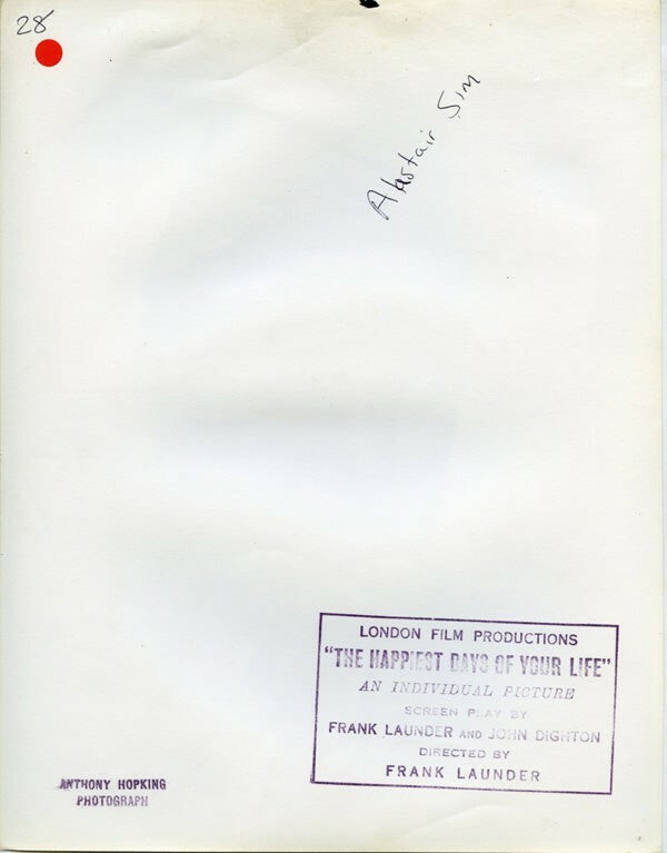 Alastair Sim Happiest Days of Your Life 1950 Stamped Original 8x10 Photo 1950 rare in Vg/Near Mint Condition This item is an ORIGINAL 8x10 photo from the historic archives of Silver Screen Mementos. This original photograph was made in the actual year the film, television show or event was produced. The movie studios produced publicity photographs for distribution to the press, photo agencies and publicity departments to advertise the film/tv show or event. Very often original photos have press release information on the reverse of the photo - movie credits, description of the scene, event and people involved. This is a historic piece of cinema art and is being offered from one collector to another, no rights given or implied. Silver Screen are gradually releasing thousands of Original Photographs, Transparencies, Negatives, Lobby Cards, Posters, Magazines and other memorabilia from our historic archive.