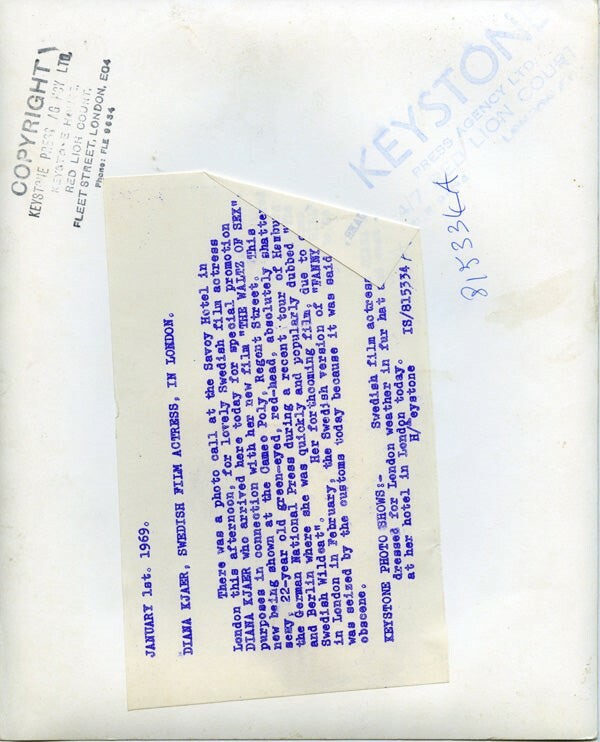 Diana Kjaer Swedish Star Posing Waltz of Sex 1969 Original Double Weight 8x10 Photo with paper caption snipe Stamoped in VG/Near Mint Condition This item is an ORIGINAL 8x10 photo from the historic archives of Silver Screen Mementos. This original photograph was made in the actual year the film, television show or event was produced. The movie studios produced publicity photographs for distribution to the press, photo agencies and publicity departments to advertise the film/tv show or event. Very often original photos have press release information on the reverse of the photo - movie credits, description of the scene, event and people involved. This is a historic piece of cinema art and is being offered from one collector to another, no rights given or implied. Silver Screen are gradually releasing thousands of Original Photographs, Transparencies, Negatives, Lobby Cards, Posters, Magazines and other memorabilia from our historic archive.