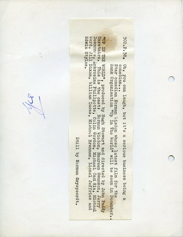 Norman Wisdom Iconic Cloth Cap Pose Up in the World 1956 Original Photo with paper caption snipe, wonderful image of teh legendary British comedy star in VG Condition (punch holes in left) This item is an ORIGINAL 8x10 photo from the historic archives of Silver Screen Mementos. This original photograph was made in the actual year the film, television show or event was produced. The movie studios produced publicity photographs for distribution to the press, photo agencies and publicity departments to advertise the film/tv show or event. Very often original photos have press release information on the reverse of the photo - movie credits, description of the scene, event and people involved. This is a historic piece of cinema art and is being offered from one collector to another, no rights given or implied. Silver Screen are gradually releasing thousands of Original Photographs, Transparencies, Negatives, Lobby Cards, Posters, Magazines and other memorabilia from our historic archive.