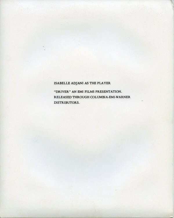 Isabelle Adjani Sultry portrait The Driver Original 8x10 Photograph Stamped 1978 VG/Near Mint This item is an ORIGINAL 8x10 photo from the historic archives of Silver Screen Mementos. This original photograph was made in the actual year the film, television show or event was produced. The movie studios produced publicity photographs for distribution to the press, photo agencies and publicity departments to advertise the film/tv show or event. Very often original photos have press release information on the reverse of the photo - movie credits, description of the scene, event and people involved. This is a historic piece of cinema art and is being offered from one collector to another, no rights given or implied. Silver Screen are gradually releasing thousands of Original Photographs, Transparencies, Negatives, Lobby Cards, Posters, Magazines and other memorabilia from our historic archive.