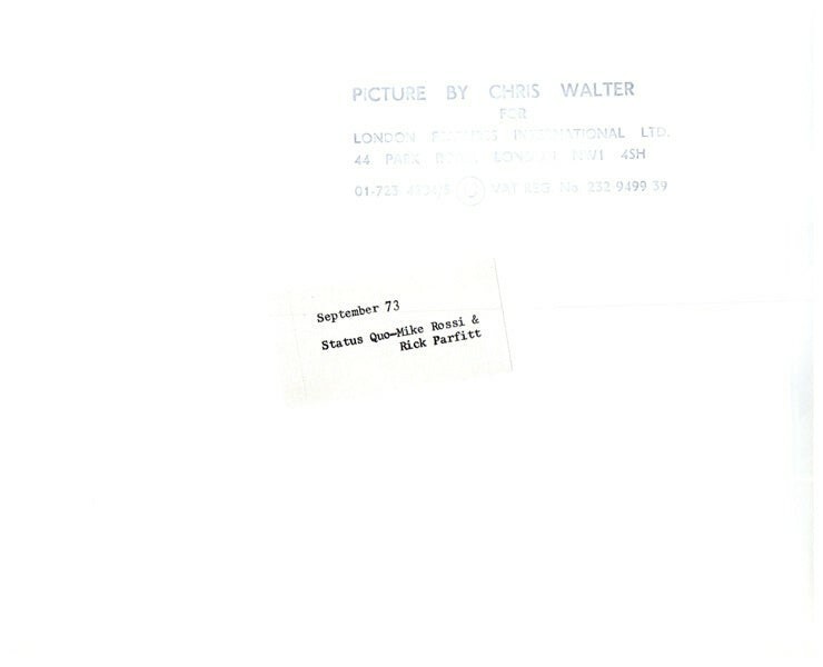 Status Quo Rick Parfitt, Francis Rossi Concert Original 8x10 Photo Agency Stamped 1973 VG/Near Mint Condition This is an Original vintage photograph from the year of the concert, photo shoot or event measuring approximately 8x10 inches (20x25 cm) unless otherwise stated. Many Original vintage photographs carry the agency or photographer stamp on the back. This is a rare collectors item being offered from one collector to another, no nights given or implied. Silver Screen are gradually releasing thousands of Original Photographs, Transparencies, Negatives, Lobby Cards, Posters, Magazines and other memorabilia from our historic archive.