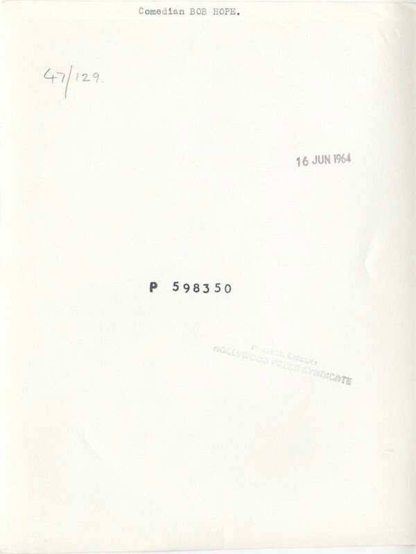 Bob Hope holding Golf Club Putter 1964 Studio Portrait Stamped Original 8x10 approx Photo in VG/Near Mint Condition (border trim) This item is an ORIGINAL 8x10 photo from the historic archives of Silver Screen Mementos. This original photograph was made in the actual year the film, television show or event was produced. The movie studios produced publicity photographs for distribution to the press, photo agencies and publicity departments to advertise the film/tv show or event. Very often original photos have press release information on the reverse of the photo - movie credits, description of the scene, event and people involved. This is a historic piece of cinema art and is being offered from one collector to another, no rights given or implied. Silver Screen are gradually releasing thousands of Original Photographs, Transparencies, Negatives, Lobby Cards, Posters, Magazines and other memorabilia from our historic archive.