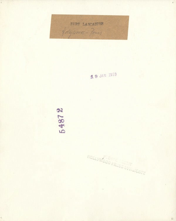 Burt Lancaster 1959 Portrait Double Weight Stamped Original 8x10 approx Photograph Rare in VG/Near Mint Condition This item is an ORIGINAL 8x10 photo from the historic archives of Silver Screen Mementos. This original photograph was made in the actual year the film, television show or event was produced. The movie studios produced publicity photographs for distribution to the press, photo agencies and publicity departments to advertise the film/tv show or event. Very often original photos have press release information on the reverse of the photo - movie credits, description of the scene, event and people involved. This is a historic piece of cinema art and is being offered from one collector to another, no rights given or implied. Silver Screen are gradually releasing thousands of Original Photographs, Transparencies, Negatives, Lobby Cards, Posters, Magazines and other memorabilia from our historic archive.