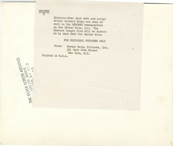 Dragnet Jack Webb Vintage typewriter behind scenes double weight Original 8x10 Photo with paper caption snipe in Near Mint Condition This item is an ORIGINAL 8x10 photo from the historic archives of Silver Screen Mementos. This original photograph was made in the actual year the film, television show or event was produced. The movie studios produced publicity photographs for distribution to the press, photo agencies and publicity departments to advertise the film/tv show or event. Very often original photos have press release information on the reverse of the photo - movie credits, description of the scene, event and people involved. This is a historic piece of cinema art and is being offered from one collector to another, no rights given or implied. Silver Screen are gradually releasing thousands of Original Photographs, Transparencies, Negatives, Lobby Cards, Posters, Magazines and other memorabilia from our historic archive.