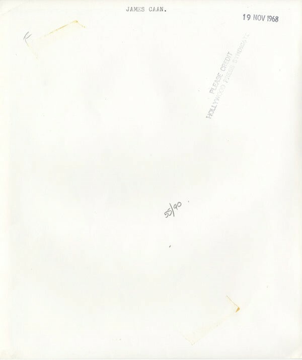James Caan Vintage Handsome Smiling Studio Portrait Original 8x10 Photo 1968 VG/Near Mint Condition (Border Trim) This item is an ORIGINAL 8x10 photo from the historic archives of Silver Screen Mementos. This original photograph was made in the actual year the film, television show or event was produced. The movie studios produced publicity photographs for distribution to the press, photo agencies and publicity departments to advertise the film/tv show or event. Very often original photos have press release information on the reverse of the photo - movie credits, description of the scene, event and people involved. This is a historic piece of cinema art and is being offered from one collector to another, no rights given or implied. Silver Screen are gradually releasing thousands of Original Photographs, Transparencies, Negatives, Lobby Cards, Posters, Magazines and other memorabilia from our historic archive.