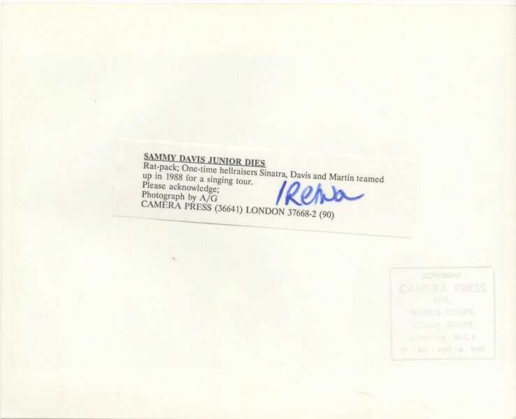 Frank Sinatra Sammy Davis Jr Dean Martin 1988 Rat Pack Singing Tour Original 8x10 Photo Stamped Snipe Near Mint Condition This item is an ORIGINAL 8x10 photo from the historic archives of Silver Screen Mementos. This original photograph was made in the actual year the film, television show or event was produced. The movie studios produced publicity photographs for distribution to the press, photo agencies and publicity departments to advertise the film/tv show or event. Very often original photos have press release information on the reverse of the photo - movie credits, description of the scene, event and people involved. This is a historic piece of cinema art and is being offered from one collector to another, no rights given or implied. Silver Screen are gradually releasing thousands of Original Photographs, Transparencies, Negatives, Lobby Cards, Posters, Magazines and other memorabilia from our historic archive.