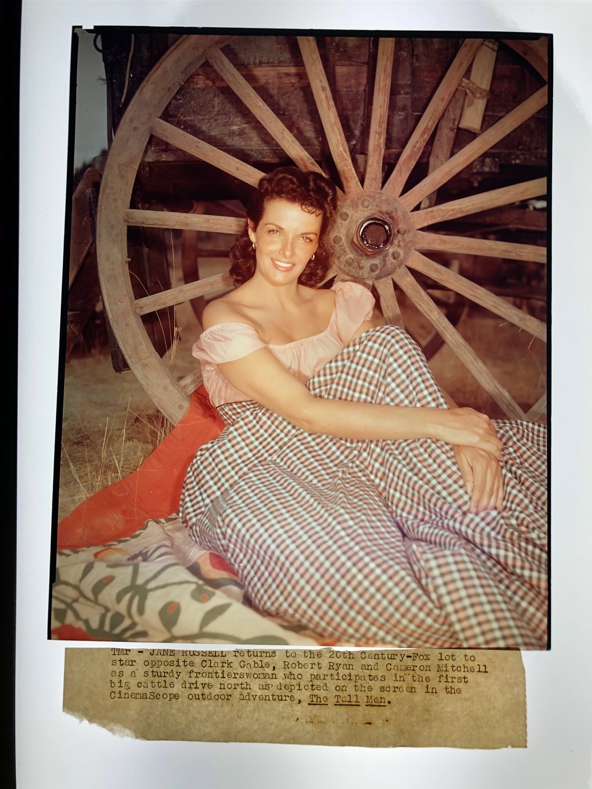 Jane Russell Breathtaking Glamour Pin Up Tall Men Original 8x10 Transparency - Absolutely stunning vivid color portrait of the sexy star posing by wagon wheel from the 1955 western The Tall Men co-starring Clark Gable. This is a truly wonderful collectors item being released from our historic archives. This is an original studio or photographer's 8x10 inches Color slide transparency from our historic archive. This is a real collector's item and would make superb quality photographs or prints. This would also be a great addition to any collection or image archive. This original Color slide transparency is in Excellent condition. This collector's item is being sold from one collector to another, no rights are given or implied. Silver Screen Mementos are gradually releasing from their vast archives thousands of original photographs, transparencies, negatives, slides, lobby cards and other movie or television memorabilia.