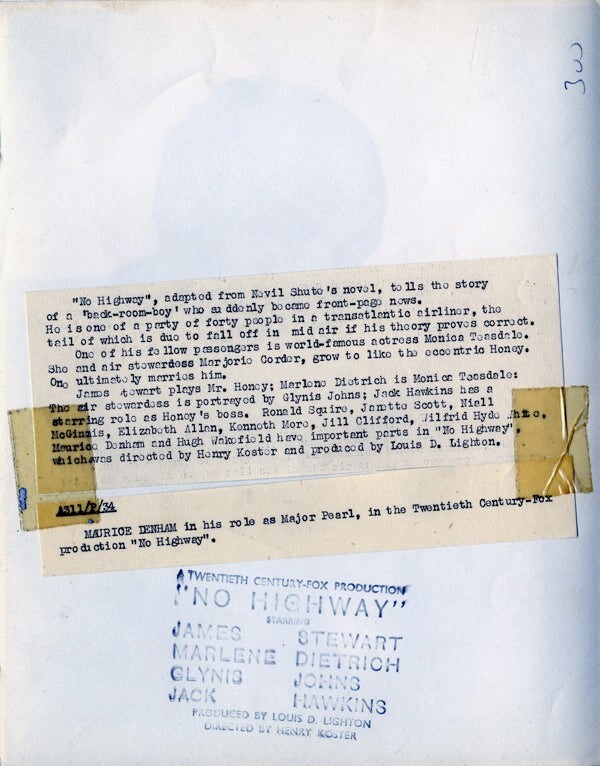 Maurice Denham Smoking Pipe 1951 No Highway in Sky Original Stamped 8x10 Photo with paper caption snipe VG/Near Mint Condition This item is an ORIGINAL 8x10 photo from the historic archives of Silver Screen Mementos. This original photograph was made in the actual year the film, television show or event was produced. The movie studios produced publicity photographs for distribution to the press, photo agencies and publicity departments to advertise the film/tv show or event. Very often original photos have press release information on the reverse of the photo - movie credits, description of the scene, event and people involved. This is a historic piece of cinema art and is being offered from one collector to another, no rights given or implied. Silver Screen are gradually releasing thousands of Original Photographs, Transparencies, Negatives, Lobby Cards, Posters, Magazines and other memorabilia from our historic archive.