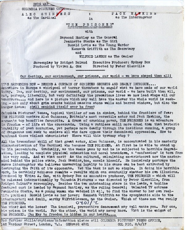 The Prisoner Alec Guinness Jack Hawkins Original 8x10 Photo 1955 with paper caption snipe VG Condition This item is an ORIGINAL 8x10 photo from the historic archives of Silver Screen Mementos. This original photograph was made in the actual year the film, television show or event was produced. The movie studios produced publicity photographs for distribution to the press, photo agencies and publicity departments to advertise the film/tv show or event. Very often original photos have press release information on the reverse of the photo - movie credits, description of the scene, event and people involved. This is a historic piece of cinema art and is being offered from one collector to another, no rights given or implied. Silver Screen are gradually releasing thousands of Original Photographs, Transparencies, Negatives, Lobby Cards, Posters, Magazines and other memorabilia from our historic archive.