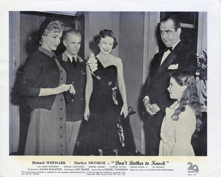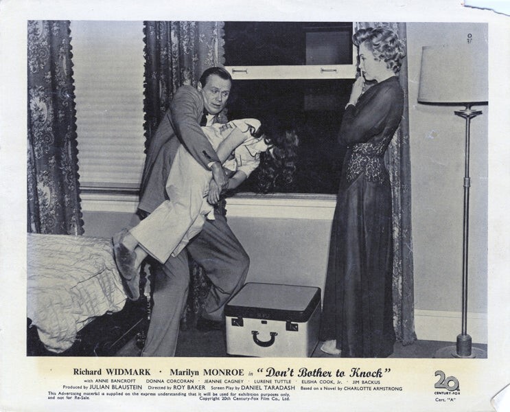 Don't Bother To Knock Original Lobby Card 1952 MARILYN MONROE Richard Widmark Very rare Original release card from the classic Marilyn Monroe, Richard Widmark and Anne Bancroft Film Noir. VG/Near Mint Condition (no pin holes, no tears, very minor wear) Silver Screen Mementos are pleased to be able to offer this authentic original Lobby Card measuring 8x10 inches. This lobby card is from Great Britain and was printed during the actual year the film was released in movie theaters. The lobby card (also known as Front of House/ FOH card in the UK) was created by the film studios to publicize the movie and was intended for display outside the movie theatre in special glass display boxes. These are NOT reproductions! You are looking at a truly original piece of cinema art, a genuine collector's item. We have a huge archive of over 250,000 original lobby cards, mostly from the 1930's to the 1980's. We will be releasing many more rare gems from our vast collection, which will include lobby cards, original photographs, movie stills, magazines, brochures negatives, transparencies, slides and other collectible items of movie memorabilia.