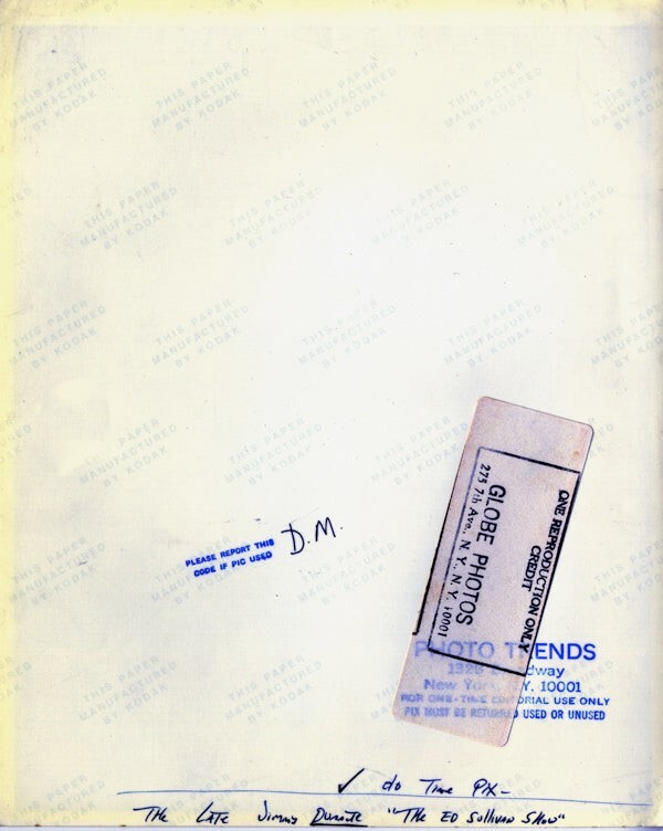 Jimmy Durante performs Ed Sullivan Show Vintage Stamped Original 8x10 Photo This item is an ORIGINAL 8x10 photo from the historic archives of Silver Screen Mementos. This original photograph was made in the actual year the film, television show or event was produced. The movie studios produced publicity photographs for distribution to the press, photo agencies and publicity departments to advertise the film/tv show or event. Very often original photos have press release information on the reverse of the photo - movie credits, description of the scene, event and people involved. This is a historic piece of cinema art and is being offered from one collector to another, no rights given or implied. Silver Screen are gradually releasing thousands of Original Photographs, Transparencies, Negatives, Lobby Cards, Posters, Magazines and other memorabilia from our historic archive.