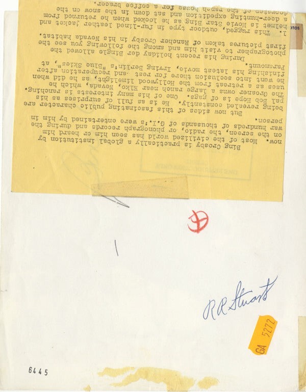 Bing Crosby 1950's Ranch Pose holding rifle Original 8x10 Photo Stamped Snipe Good/VG Condition (1/2" tear top margin no paper loss, wear to edges) This item is an ORIGINAL 8x10 photo from the historic archives of Silver Screen Mementos. This original photograph was made in the actual year the film, television show or event was produced. The movie studios produced publicity photographs for distribution to the press, photo agencies and publicity departments to advertise the film/tv show or event. Very often original photos have press release information on the reverse of the photo - movie credits, description of the scene, event and people involved. This is a historic piece of cinema art and is being offered from one collector to another, no rights given or implied. Silver Screen are gradually releasing thousands of Original Photographs, Transparencies, Negatives, Lobby Cards, Posters, Magazines and other memorabilia from our historic archive.