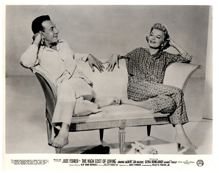 The High Cost of Loving Original Lobby Card Jose Ferrer, Gena Rowlands, Jim Backus, Joanne Gilbert, Bobby Troup 1958 VG Condition Silver Screen Mementos are pleased to be able to offer this authentic original Lobby Card measuring 8x10 inches. This lobby card is from Great Britain and was printed during the actual year the film was released in movie theaters. The lobby card (also known as Front of House/ FOH card in the UK) was created by the film studios to publicize the movie and was intended for display outside the movie theatre in special glass display boxes. These are NOT reproductions! You are looking at a truly original piece of cinema art, a genuine collector's item. We have a huge archive of over 250,000 original lobby cards, mostly from the 1930's to the 1980's. We will be releasing many more rare gems from our vast collection, which will include lobby cards, original photographs, movie stills, magazines, brochures negatives, transparencies, slides and other collectible items of movie memorabilia.