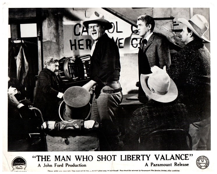 The Man Who Shot Liberty Valance Original Lobby Card John Wayne, James Stewart, Vera Miles, Lee Marvin, Woody Strode, Andy Devine, John Carradine, Lee Van Cleef Classic Western 1962 Good/VG Condition (1" tear right margin no paper loss) Silver Screen Mementos are pleased to be able to offer this authentic original Lobby Card measuring 8x10 inches. This lobby card is from Great Britain and was printed during the actual year the film was released in movie theaters. The lobby card (also known as Front of House/ FOH card in the UK) was created by the film studios to publicize the movie and was intended for display outside the movie theatre in special glass display boxes. These are NOT reproductions! You are looking at a truly original piece of cinema art, a genuine collector's item. We have a huge archive of over 250,000 original lobby cards, mostly from the 1930's to the 1980's. We will be releasing many more rare gems from our vast collection, which will include lobby cards, original photographs, movie stills, magazines, brochures negatives, transparencies, slides and other collectible items of movie memorabilia.