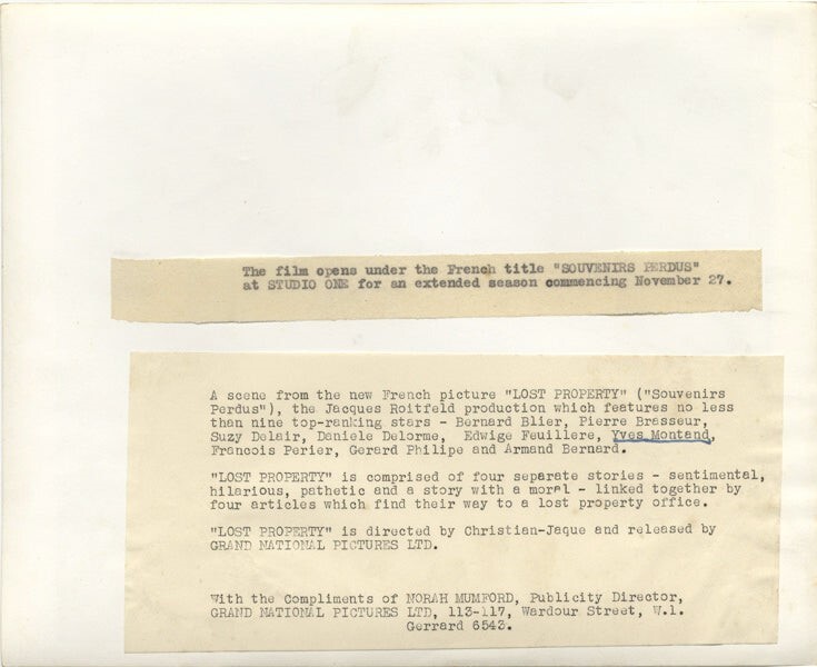 Yves Montand Lost Property aka Souvenirs Perdus aka Lost Souvenirs Handsome Portrait Original 8x10 Photo with Snipe 1950 VG/Near Mint Condition This item is an ORIGINAL 8x10 photo from the historic archives of Silver Screen Mementos. This original photograph was made in the actual year the film, television show or event was produced. The movie studios produced publicity photographs for distribution to the press, photo agencies and publicity departments to advertise the film/tv show or event. Very often original photos have press release information on the reverse of the photo - movie credits, description of the scene, event and people involved. This is a historic piece of cinema art and is being offered from one collector to another, no rights given or implied. Silver Screen are gradually releasing thousands of Original Photographs, Transparencies, Negatives, Lobby Cards, Posters, Magazines and other memorabilia from our historic archive.