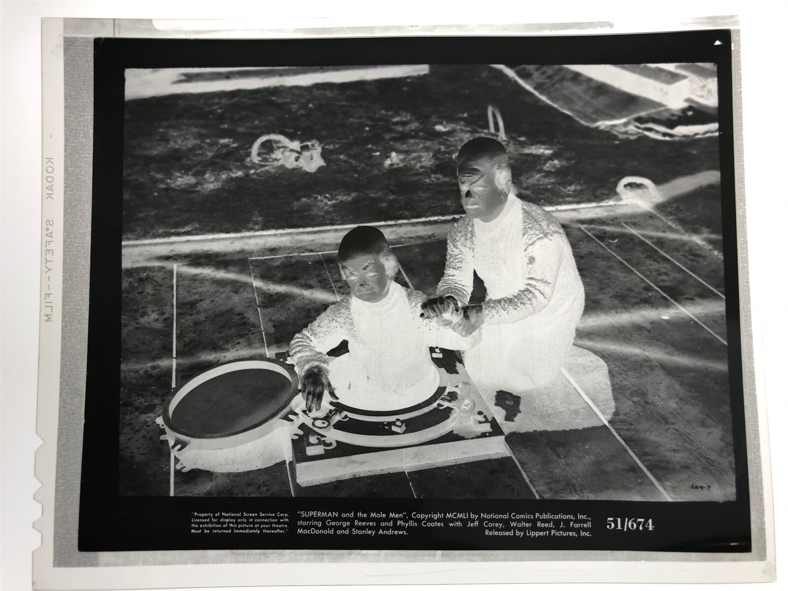 Superman and the Mole Men Climbing out of Hatch Vintage Studio 4x5 Negative 1951 This is a vintage studio or photographer's 4x5 inch black and white photographic negative from our historic archive. This vintage duplicate negative was created from the original camera negative by the studio or photographer in order to make prints and use for publications. This is a real collector's item and would make superb quality photographs or prints. This would also be a great addition to any collection or image archive. This black and white photographic negative is in Excellent condition. This collector's item is being sold from one collector to another, no rights are given or implied. Silver Screen Mementos are gradually releasing from their vast archives thousands of original photographs, transparencies, negatives, slides, lobby cards and other movie or television memorabilia.