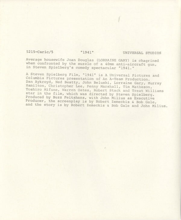 1941 Lorraine Gary anti-aircraft gun artwork Original 8x10 Photo 1979 Spielberg Near Mint This item is an ORIGINAL 8x10 photo from the historic archives of Silver Screen Mementos. This original photograph was made in the actual year the film, television show or event was produced. The movie studios produced publicity photographs for distribution to the press, photo agencies and publicity departments to advertise the film/tv show or event. Very often original photos have press release information on the reverse of the photo - movie credits, description of the scene, event and people involved. This is a historic piece of cinema art and is being offered from one collector to another, no rights given or implied. Silver Screen are gradually releasing thousands of Original Photographs, Transparencies, Negatives, Lobby Cards, Posters, Magazines and other memorabilia from our historic archive.
