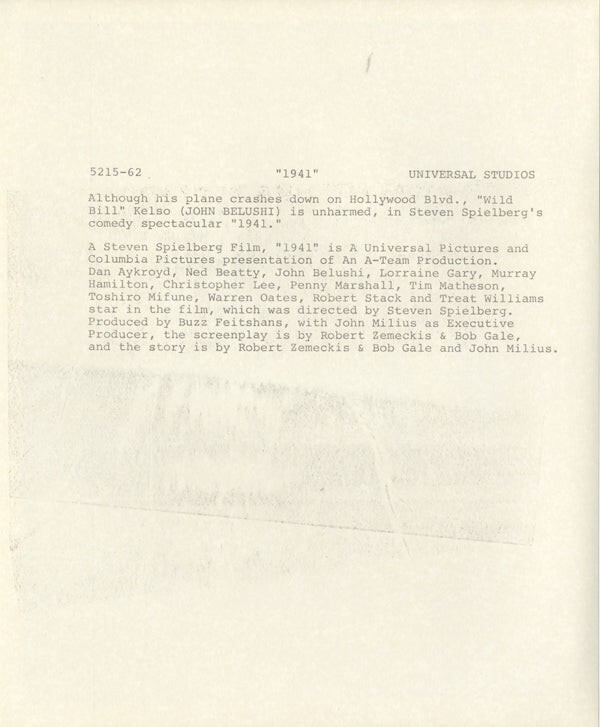 1941 John Belushi plane crash Hollywood Boulevard Original 8x10 Photo 1979 Near Mint This item is an ORIGINAL 8x10 photo from the historic archives of Silver Screen Mementos. This original photograph was made in the actual year the film, television show or event was produced. The movie studios produced publicity photographs for distribution to the press, photo agencies and publicity departments to advertise the film/tv show or event. Very often original photos have press release information on the reverse of the photo - movie credits, description of the scene, event and people involved. This is a historic piece of cinema art and is being offered from one collector to another, no rights given or implied. Silver Screen are gradually releasing thousands of Original Photographs, Transparencies, Negatives, Lobby Cards, Posters, Magazines and other memorabilia from our historic archive.
