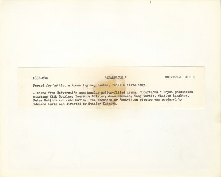Spartacus Facing Roman Army Legions Battle Scene Original 8x10 Photo with Snipe 1962 Near Mint Condition This item is an ORIGINAL 8x10 photo from the historic archives of Silver Screen Mementos. This original photograph was made in the actual year the film, television show or event was produced. The movie studios produced publicity photographs for distribution to the press, photo agencies and publicity departments to advertise the film/tv show or event. Very often original photos have press release information on the reverse of the photo - movie credits, description of the scene, event and people involved. This is a historic piece of cinema art and is being offered from one collector to another, no rights given or implied. Silver Screen are gradually releasing thousands of Original Photographs, Transparencies, Negatives, Lobby Cards, Posters, Magazines and other memorabilia from our historic archive.