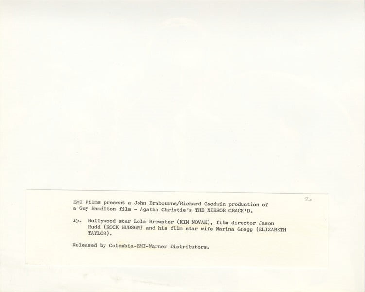 The Mirror Crack'd Rock Hudson, Elizabeth Taylor, Kim Novak Original 8x10 Photo with Snipe 1980 Near Mint Condition This item is an ORIGINAL 8x10 photo from the historic archives of Silver Screen Mementos. This original photograph was made in the actual year the film, television show or event was produced. The movie studios produced publicity photographs for distribution to the press, photo agencies and publicity departments to advertise the film/tv show or event. Very often original photos have press release information on the reverse of the photo - movie credits, description of the scene, event and people involved. This is a historic piece of cinema art and is being offered from one collector to another, no rights given or implied. Silver Screen are gradually releasing thousands of Original Photographs, Transparencies, Negatives, Lobby Cards, Posters, Magazines and other memorabilia from our historic archive.