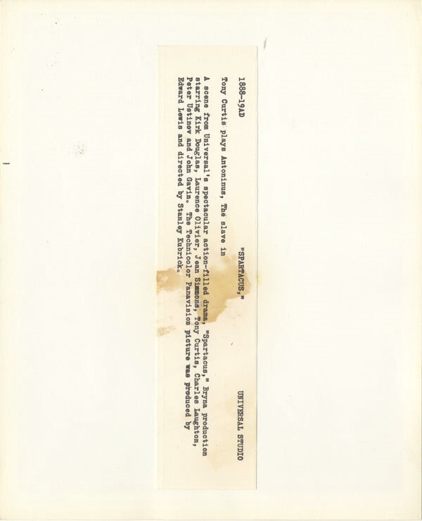Tony Curtis Spartacus Handsome Antoninus Profile Original 8x10 Photo with Snipe 1960 VG/Near Mint Condition This item is an ORIGINAL 8x10 photo from the historic archives of Silver Screen Mementos. This original photograph was made in the actual year the film, television show or event was produced. The movie studios produced publicity photographs for distribution to the press, photo agencies and publicity departments to advertise the film/tv show or event. Very often original photos have press release information on the reverse of the photo - movie credits, description of the scene, event and people involved. This is a historic piece of cinema art and is being offered from one collector to another, no rights given or implied. Silver Screen are gradually releasing thousands of Original Photographs, Transparencies, Negatives, Lobby Cards, Posters, Magazines and other memorabilia from our historic archive.