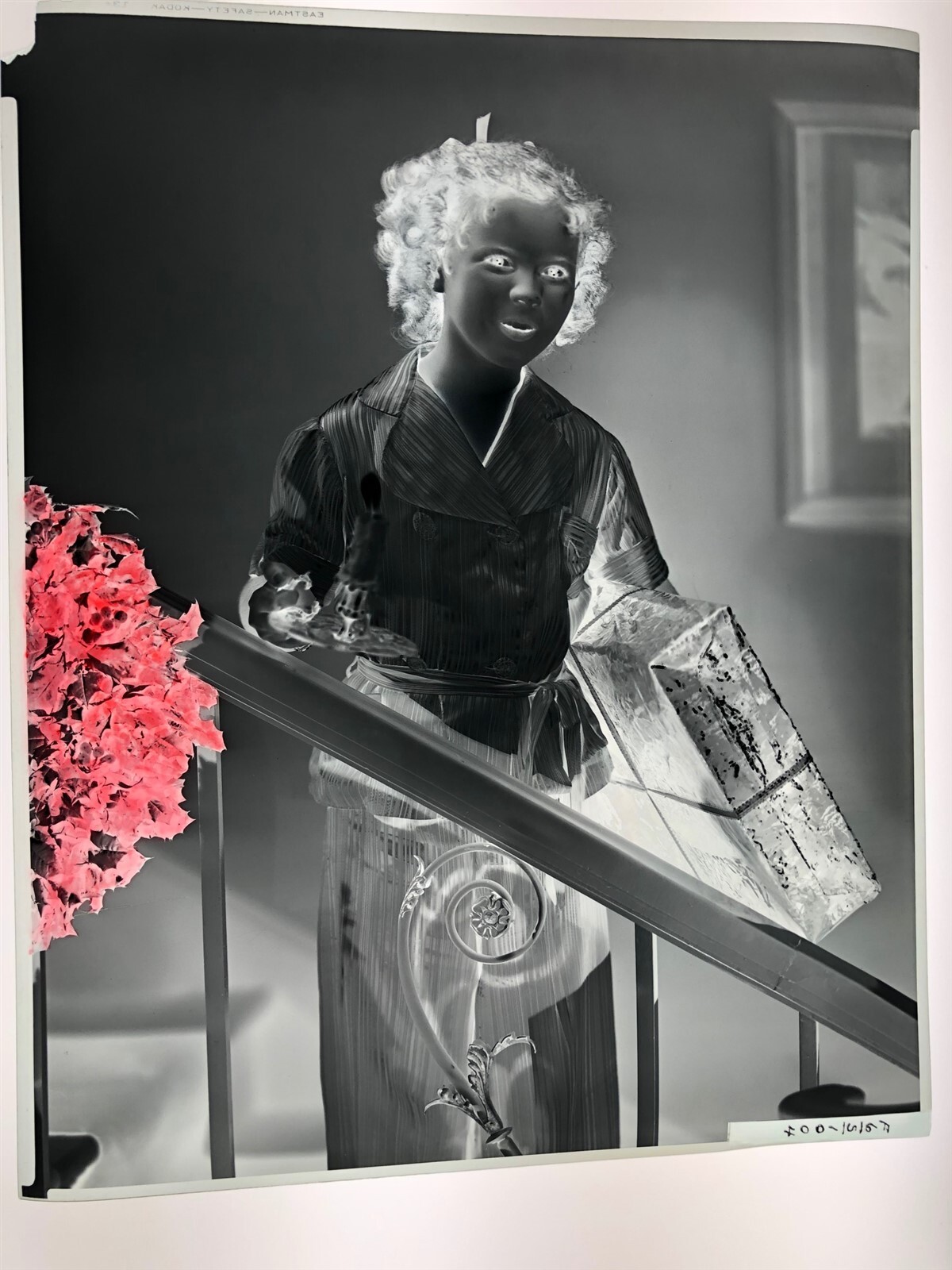 Shirley Temple Amazing Original 8x10 Acetate Camera Negative - A truly wonderful portrait capturing the legendary Child star posing on staircase holding candle and Christmas present wearing pajamas. This is an amazing Original 8x10 inch Camera Negative with hand retouched highlights, including colorized flowers and hand applied India ink code. A truly exceptional collectors item being released from our historic archives! This is an original studio or photographer's 8x10 inches black and white photographic negative from our historic archive. This is a real collector's item and would make superb quality photographs or prints. This would also be a great addition to any collection or image archive. This original black and white photographic negative is in Excellent condition. This collector's item is being sold from one collector to another, no rights are given or implied. Silver Screen Mementos are gradually releasing from their vast archives thousands of original photographs, transparencies, negatives, slides, lobby cards and other movie or television memorabilia.