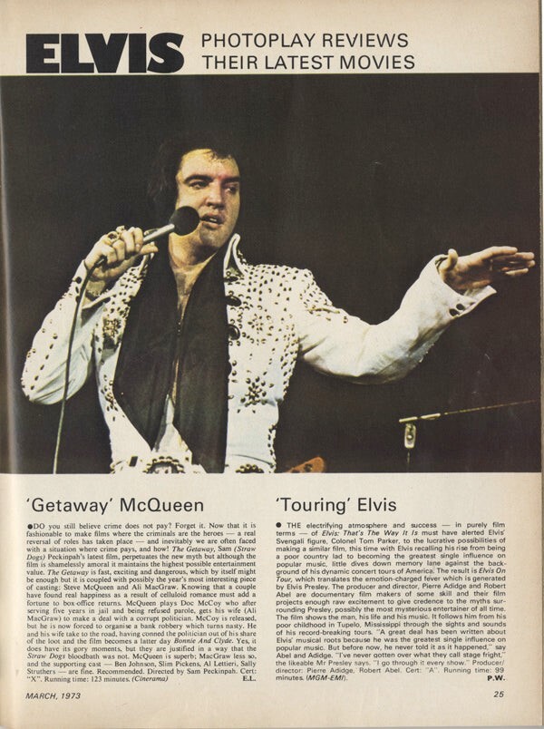 Photoplay Magazine The Getaway cover Steve McQueen Elvis Presley Stella Stevens March 1973 This is the complete issue of the Photoplay film magazine containing color and b/w pictures, articles, interviews, reviews, advertisments and features. This vintage original magazine measures approximately 8.5 x 11 inches. Silver Screen Mementos are gradually releasing from their vast archives thousands of original photographs, transparencies, negatives, slides, lobby cards, magazines, brochures, press books and other movie or television memorabilia