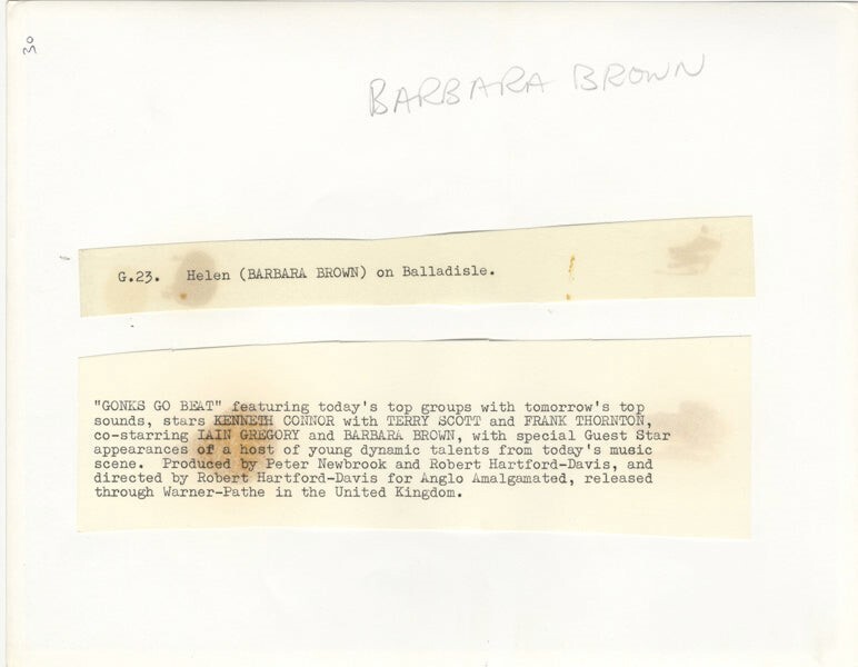 Barbara Brown Gonks Go Beat Glamour Pin up Rock Music Cult Sci Fi Original 8x10 Photo Stamped with Snipe 1964 VG/Near Mint Condition This item is an ORIGINAL 8x10 photo from the historic archives of Silver Screen Mementos. This original photograph was made in the actual year the film, television show or event was produced. The movie studios produced publicity photographs for distribution to the press, photo agencies and publicity departments to advertise the film/tv show or event. Very often original photos have press release information on the reverse of the photo - movie credits, description of the scene, event and people involved. This is a historic piece of cinema art and is being offered from one collector to another, no rights given or implied. Silver Screen are gradually releasing thousands of Original Photographs, Transparencies, Negatives, Lobby Cards, Posters, Magazines and other memorabilia from our historic archive.