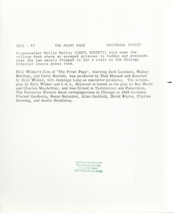 Carol Burnett The Front Page Leggy Portrait Original 8x10 Photo with Snipe 1974 Near Mint Condition This item is an ORIGINAL 8x10 photo from the historic archives of Silver Screen Mementos. This original photograph was made in the actual year the film, television show or event was produced. The movie studios produced publicity photographs for distribution to the press, photo agencies and publicity departments to advertise the film/tv show or event. Very often original photos have press release information on the reverse of the photo - movie credits, description of the scene, event and people involved. This is a historic piece of cinema art and is being offered from one collector to another, no rights given or implied. Silver Screen are gradually releasing thousands of Original Photographs, Transparencies, Negatives, Lobby Cards, Posters, Magazines and other memorabilia from our historic archive.