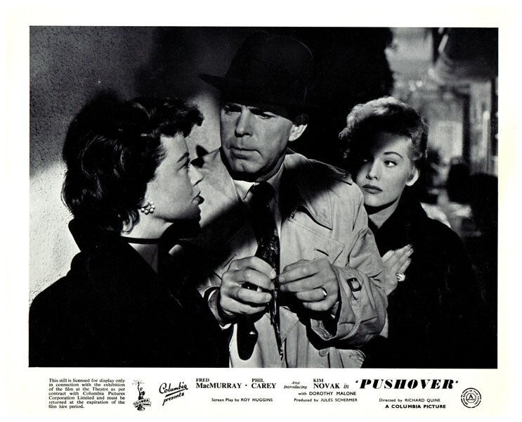 Pushover Original Lobby Card Kim Novak, Fred MacMurray, Phil Carey, Dorothy Malone Film Noir 1954 VG Condition Silver Screen Mementos are pleased to be able to offer this authentic original Lobby Card measuring 8x10 inches. This lobby card is from Great Britain and was printed during the actual year the film was released in movie theaters. The lobby card (also known as Front of House/ FOH card in the UK) was created by the film studios to publicize the movie and was intended for display outside the movie theatre in special glass display boxes. These are NOT reproductions! You are looking at a truly original piece of cinema art, a genuine collector's item. We have a huge archive of over 250,000 original lobby cards, mostly from the 1930's to the 1980's. We will be releasing many more rare gems from our vast collection, which will include lobby cards, original photographs, movie stills, magazines, brochures negatives, transparencies, slides and other collectible items of movie memorabilia.
