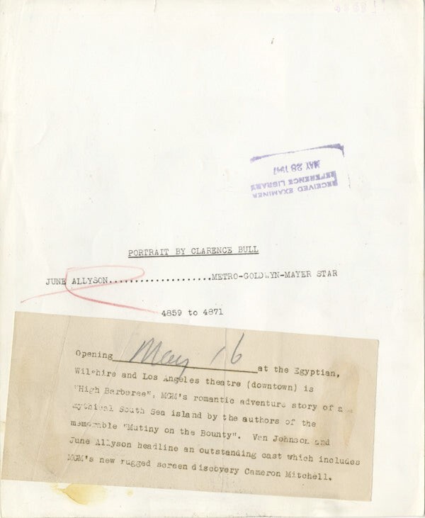 June Allyson High Barbaree Publicity Glamour Pin up Original 8x10 Photo with Snipe 1947 Good/VG Condition (1/4" tear top margin no paper loss, wear to edges) This item is an ORIGINAL 8x10 photo from the historic archives of Silver Screen Mementos. This original photograph was made in the actual year the film, television show or event was produced. The movie studios produced publicity photographs for distribution to the press, photo agencies and publicity departments to advertise the film/tv show or event. Very often original photos have press release information on the reverse of the photo - movie credits, description of the scene, event and people involved. This is a historic piece of cinema art and is being offered from one collector to another, no rights given or implied. Silver Screen are gradually releasing thousands of Original Photographs, Transparencies, Negatives, Lobby Cards, Posters, Magazines and other memorabilia from our historic archive.